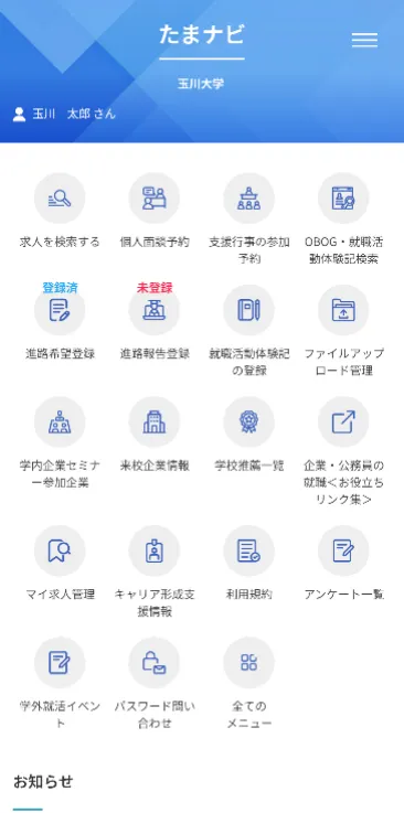企業から直接届く求人やインターンシップ情報の検索、各種イベント案内、個別相談の予約などができます。